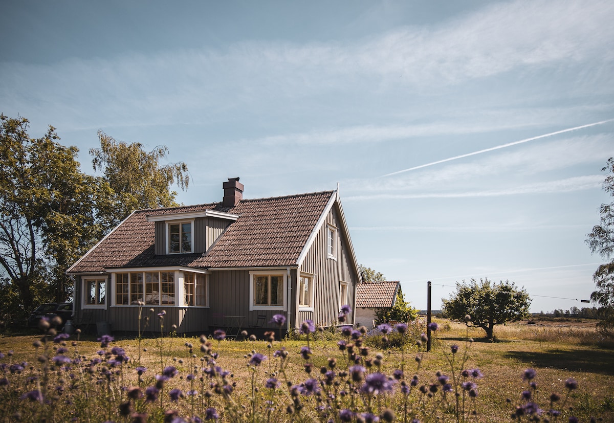 Acogedora cabaña con chimenea junto a bosques y prados.