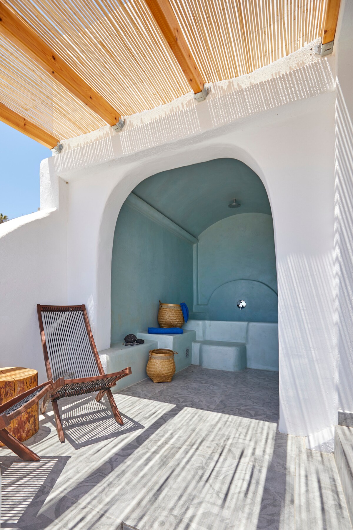 Esta elegante suite está encaramada en los acantilados de la caldera en Oia. Combina la arquitectura tradicional de las Cícladas con un estilo decorativo minimalista, por lo que es la opción perfecta para aquellos que quieren relajarse. La suite tiene aproximadamente 37 metros cuadrados, cuenta con una bañera de hidromasaje privada al aire libre en una cueva, que ofrece privacidad junto con impresionantes vistas de la caldera y el volcán. El desayuno está incluido en el precio. La habitación está equipada con aire acondicionado, wifi gratuito, cafetera y tetera, artículos de tocador y TV inteligente.