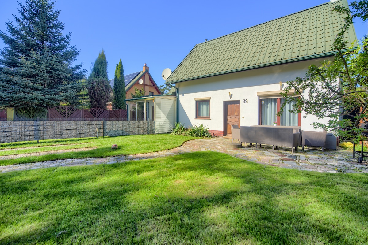 Przestronny, klimatyzowany, dwupoziomowy domek z ogródkiem, gwarantuje dużą swobodę i spokój. Położony w cichej zalesionej okolicy, która zapewni spokój i pełen komfort, nawet najbardziej wymagającym. Piętro to dwie oddzielne sypialnie (1 z dwoma jednoosobowymi łóżkami oraz 2 z łóżkiem małżeńskim). Parter to w pełni wyposażona kuchnia połączona z salonem oraz przytulna łazienka. Do domku przynależy miejsce parkingowe oraz ogród z meblami ogrodowymi i grillem. Teren ośrodka jest ogrodzony.