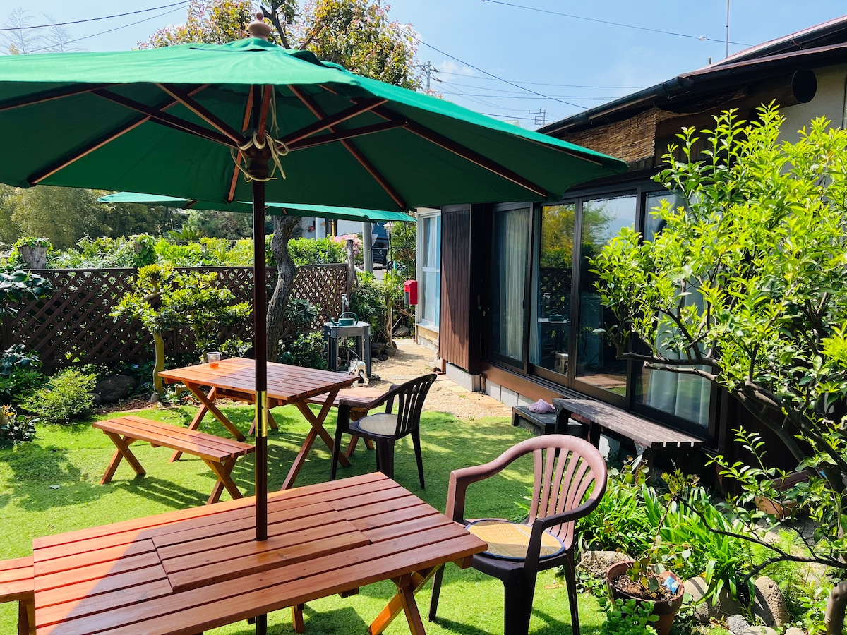 Minpaku Gororin es una casa de huéspedes privada ubicada en Yugawara-machi, Kanagawa. Los anfitriones, un matrimonio de la zona, han reformado una antigua casa de 60 años de antigüedad. Viven en la casa principal adyacente y están disponibles para ofrecer orientación y asistencia. En nuestras instalaciones podrá disfrutar de una barbacoa en el jardín con vistas al mar (el equipo es gratuito). Proporcionamos carbón, encendedores, platos de papel y utensilios de cocina. La habitación es muy espaciosa. Hay juegos y juguetes antiguos para que disfruten tanto adultos como niños. La popular playa de Atami se encuentra muy cerca y también se celebran espectáculos de fuegos artificiales. ¡También es muy fácil llegar al Monte Fuji, ya que se tarda unos 30 minutos en llegar a Mishima a través de Atami! ¡En la península de Manazuru podrá disfrutar de la pesca y los baños en la playa, y en Okuyugawara podrá disfrutar de los baños termales y los colores del otoño! Hatsushima, un lugar popular entre los jóvenes, también está cerca. También disponemos de un congelador para los que vayan a pescar en Izu. ¡Por qué no lo disfruta con la pensión Gororin como base! Los niños menores de 12 años tienen un descuento del 30%. ¡Pueden alojarse hasta 5 personas! ¡El estacionamiento es gratuito! Si vienes en tren, te recogemos en la estación de Manazuru. ¡Reserva ya para familias, parejas y amigos!