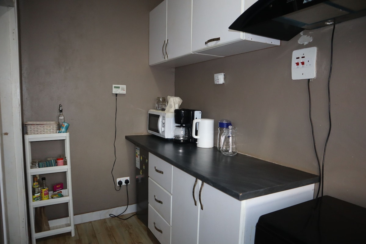 La Casa de Campo Talemwa es un pequeño refugio con cocina para una familia o grupo de hasta cuatro personas. La casa es un bungalow de 3 dormitorios completamente amueblado y aislado ubicado en una granja en un vecindario agradable y sin ruido. Los huéspedes podrán acceder a 2 de los 3 dormitorios, una cocina amueblada para preparar comidas, mucho espacio para estacionar, una sala de estar y un gran jardín. El arreglo del dormitorio es de dos habitaciones con literas que podrían colocarse una junto a la otra si se solicita.