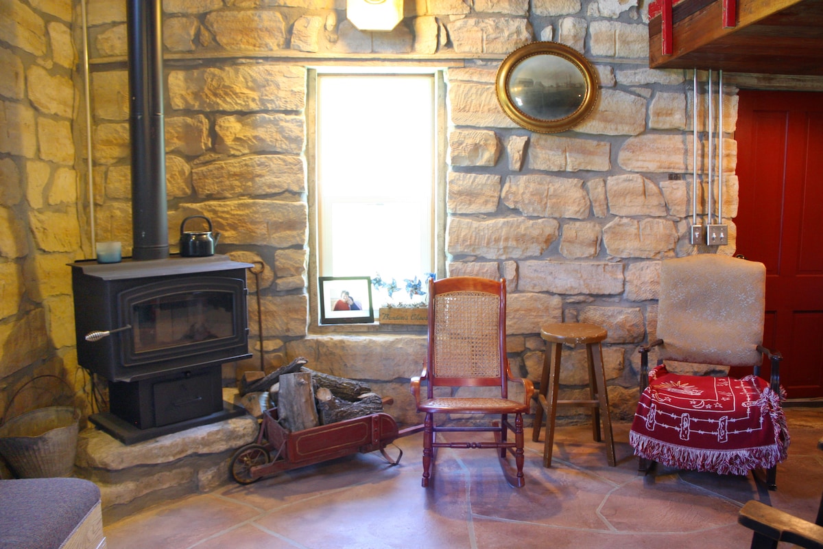Mi casa es un edificio histórico de piedra caliza con un loft, ubicado en mi granja familiar. A una milla de la interestatal y a 6 millas al norte de Ellsworth, te encantará su comodidad tanto como su comodidad, historia y encanto pintoresco. Mi casa es ideal para parejas y aventureros solitarios que buscan una experiencia única en el país que no esté muy lejos de los caminos trillados. Este es un edificio privado cerca de la granja principal con su propia sala de estar, cocina americana, baño y dormitorio loft (queen).