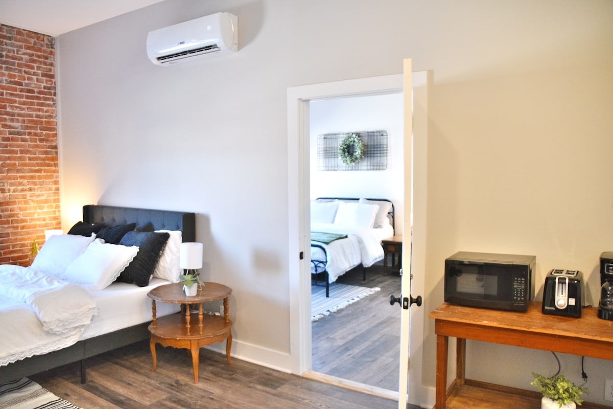 Contempla el impecable ayuntamiento con la Estatua de la Libertad y una escultura de bronce que marca la ciudad donde el Honesto Abe visitó justo antes de anunciar su candidatura a la presidencia. Los ladrillos originales y la madera de esta casa única de 170 años han sobrevivido al paso del tiempo. Sube en ascensor (o por las escaleras) hasta el segundo piso. Situado en el corazón del centro histórico de Leavenworth, la primera ciudad de Kansas. A pocas manzanas hay varias cafeterías, panaderías, boutiques y bares. Ubicado a solo 10 millas de la galardonada ciudad turística de Weston, que tiene muchas cervecerías, bodegas y rutas de senderismo. ¡No encontrarás esto en ningún otro lugar! Suelos originales y amplios pisos de madera que se colocaron hace 165 años y paredes de ladrillo originales que han resistido el paso del tiempo. Una vista desde nueve ventanas que dan a nuestro prístino ayuntamiento con la estatua de la libertad y la estatua de Abraham Lincoln. (¡Lincoln anunció su candidatura a la presidencia allí mismo en Leavenworth!) ¡Y pensar que lo más probable es que cruzara la calle y entrara en nuestro edificio, ya que era un salón en ese momento! Entrarás en nuestro loft desde la calle mediante un teclado y hay una pequeña habitación que conduce a nuestro nuevo ascensor (gran puerta de acero) para llevarte al segundo piso. Las instrucciones para el ascensor están en la pared. Muy fácil, solo cierra siempre la puerta blanca de acordeón del ascensor en caso de que tu grupo lo llame desde otro piso. Tu grupo es la única persona que tiene acceso a este ascensor. La hora de llegada es entre las 16:00 y las 19:00 horas. Envíanos un mensaje de texto si no es en ese plazo. La salida es a las 11:00 h. Una vez más, ¡envíanos un mensaje de texto si necesitas más tiempo! Mac y Stacy siempre están a solo un mensaje de distancia y pueden estar allí en 10 minutos. #913-651-7798. ¡Envíanos un mensaje de texto si tienes alguna pregunta! Sube en un ascensor personalizado al espacio abierto pero acogedor sobre la boutique de velas y regalos del anfitrión. El apartamento es una base estupenda para explorar Kansas City, Fort Leavenworth, la sede del condado y la pintoresca Weston, Missouri. Tiendas, restaurantes, cafeterías y bares están a solo unos pasos. Hay un gran aparcamiento detrás del edificio en la calle 5. Televisor de 65 pulgadas, pero no tenemos cable. Hay un reproductor de DVD y puedes conectar tu teléfono al televisor para ver tus vídeos, Hulu, etc. ¡Eso es lo que hacemos, y usamos los datos de nuestro teléfono u ordenador para mostrarlos en la pantalla del televisor!