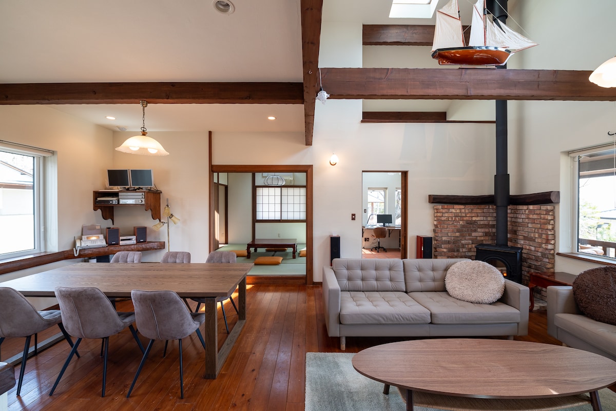 Una linda casa de troncos ubicada en un pueblo en la ladera de una montaña rodeado de naturaleza. A 80 minutos de Tokio. Un espacio tranquilo donde el canto de los pájaros y el murmullo del río te curarán. A unos 10 minutos en coche de Arakawa Iwatai, donde se puede descender por la línea de Nagatoro. Hay muchos templos históricos, por lo que recomendamos visitar los puntos de poder. Puedes hacer parapente, kayak, rafting, surf de remo, etc. Puedes moverte activamente o alquilar un bicicleta y recorrer el pueblo. En Nagatoro hay muchas tiendas de deliciosos udon y soba. También es divertido experimentar la recolección de castañas, uvas, fresas de Nagatoro, etc. ¡Si tienes suerte, también podrás ver el SL que recorre la línea de ferrocarril Chichibu, que corre paralelo a la carretera nacional! A 50 segundos a pie de la casa de troncos, hay un parque de trampolines de unos 90 pasos (reserva obligatoria) donde los niños pueden jugar a su antojo, y para cenar temprano, una barbacoa en el jardín. Por la noche, si el clima lo permite, se puede disfrutar de un momento de relax solo para adultos, bajo las estrellas, alrededor de la hoguera, o con las luces de la habitación apagadas, contemplando las llamas de la estufa de leña. Hay tres dormitorios, por lo que se puede disfrutar con varias familias, amigos, etc. ¡No te aburrirás con todas estas actividades y podrás disfrutar de Chichibu y Nagatoro! ¡Crea los mejores recuerdos en este espacio relajante en una casa de campo de estilo log house!