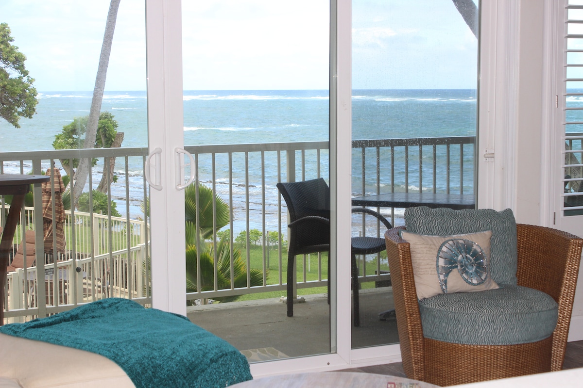 Unidad FRENTE AL MAR con espectaculares vistas al mar. Duerme escuchando las olas y despierta viendo el amanecer en la cómoda cama y el colchón nuevos. Disfruta de tu comida o trabaja en la hermosa mesa de borde vivo de 8 pies. Siéntate en el lanai y relájate en nuestra nueva silla y mesa muy cómodas con tu bebida favorita en la mano. Déjate hipnotizar por el ritmo de las olas, los olores de las flores tropicales que flotan sobre los vientos alisios mientras contemplas el azul profundo del Pacífico.