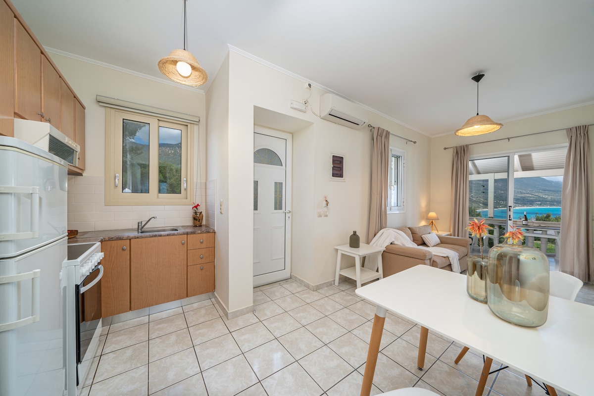 Una casa de nueva construcción abre sus puertas este año, por primera vez para dar la bienvenida incluso a los huéspedes más exigentes. La privacidad que ofrece la villa junto con la arquitectura que combina lo moderno con la decoración minimalista, en combinación con los espacios cómodos y la impresionante fachada con vistas al azul infinito del mar Jónico, lo convierten en un lugar acogedor y encantador. ¡Disfruta de tu estancia en este espacio relajante y elegante!