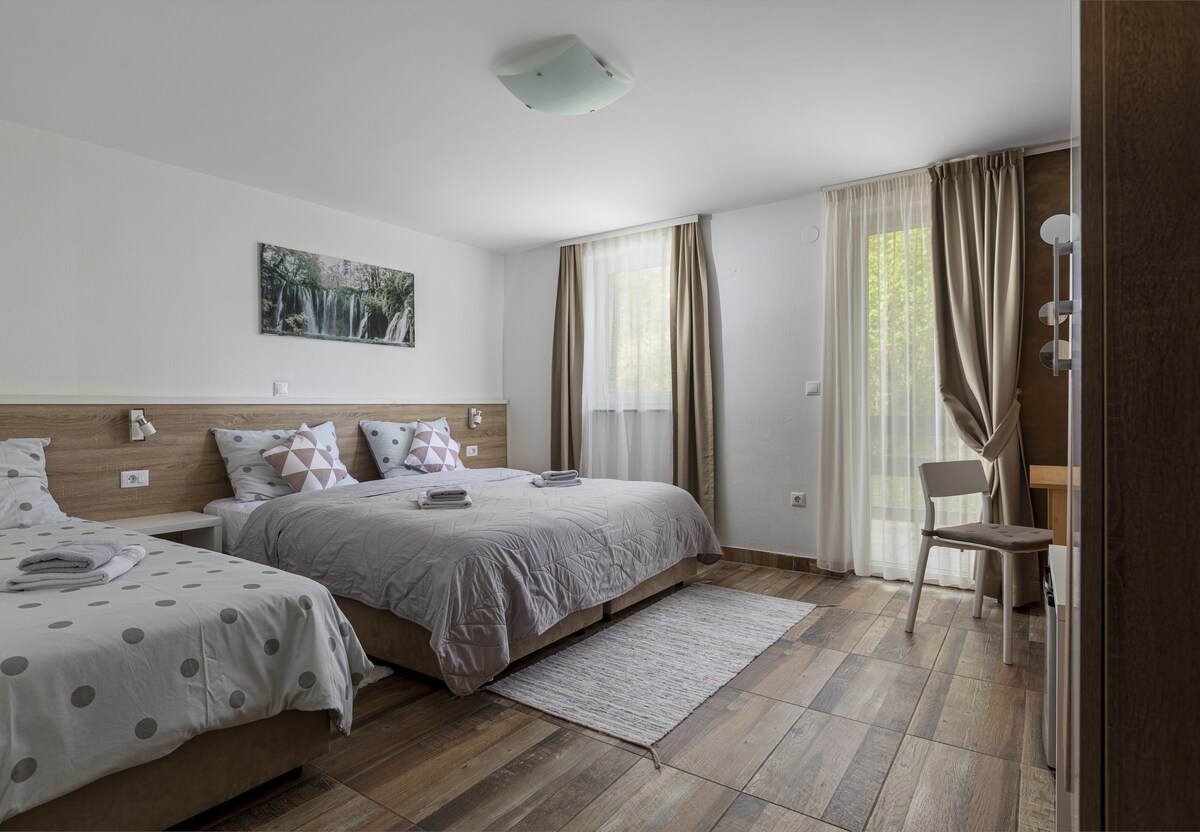 La casa está a 5 km de los lagos de Plitvice . El interior recuerda a las cabañas de madera y a la paz y la naturaleza prevalecientes. En la casa no están los propietarios , viven en ella solo huéspedes , y existe la posibilidad de alquilar toda la casa ,y es un muy buen lugar para reuniones de negocios y celebraciones.