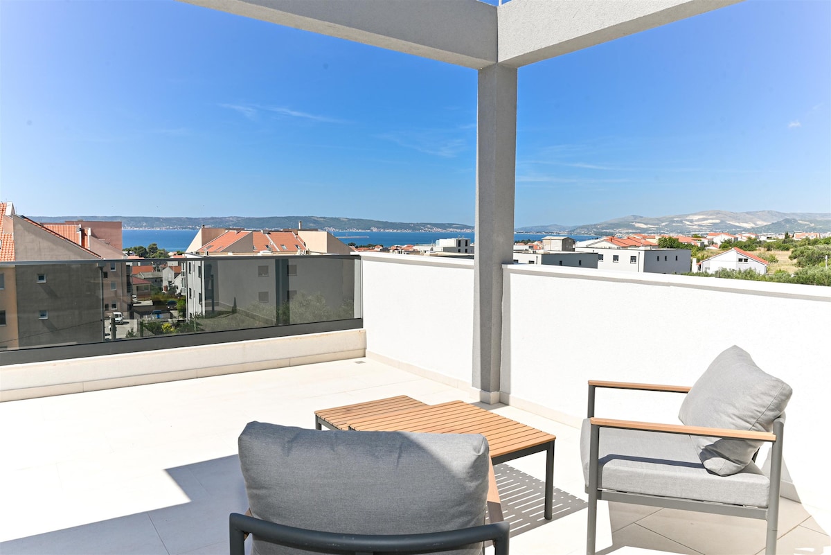 Frente al mar, planta superior con vistas increíbles. Situado entre Split, la capital de la costa de Dalmacia, a un lado y un hermoso centro vacacional de Trogir al otro lado. Cuenta con una ubicación tranquila pero práctica, a poca distancia en autobús de Split y Trogir.