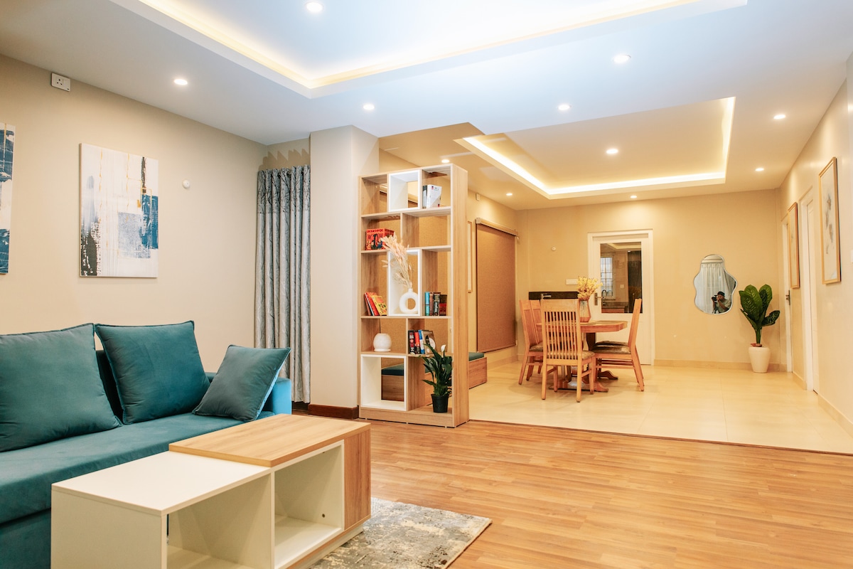 Located right at the city's heart Lazimpat, the apartment is still hidden amongst the greenery and quietness. Modern, well-designed layout, minimal interiors with well-furnished modular furniture in a 1600 sqft apartment has a spacious living and dining room, 2 bedrooms with ensuite bathrooms, a fully functional kitchen, and a powder room. Enjoy the 360° view of the city from the terrace accompanied by birds singing and lush greenery in the background.