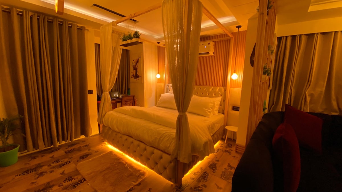 Kudarat ofrece una estancia privada en la planta baja con una piscina de inmersión adjunta al dormitorio, completamente exclusiva para tu comodidad y privacidad. Una cama de bambú estilo cabaña sobre la piscina crea un ambiente relajante y romántico, casi como si flotaras en el agua. Rodeado de plantas reales, rocas naturales y un acogedor sofá, el espacio cubierto se siente tranquilo, cálido e íntimo. Diseñado con elementos inspirados en la naturaleza, Kudarat ofrece un ambiente seguro, tranquilo y hogareño, perfecto para parejas y celebraciones especiales 😇