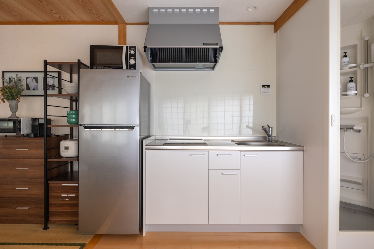 Karuizawa Station 5min|Private Nordic Suite Enjoy a unique stay above our 1982-established restaurant. ■ Design & Comfort Produced by haluta, featuring vintage Nordic furniture. High insulation keeps the room at a constant 23°C (73°F) year-round—eco-friendly and cozy in any season. ■ Essentials - Full Kitchen - Washer & Dryer - Free shared workspace next door - Premium Koala Mattresses Savor the aroma of roast chicken from downstairs. Takeout available! 2+ nights min. Request for 1-night.