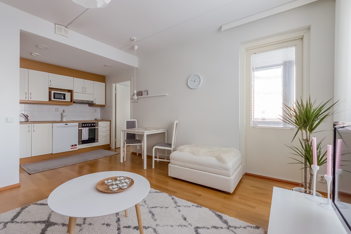 ¡Un estudio maravilloso en una ubicación excelente! El luminoso y espacioso estudio se encuentra justo al lado del parque Ainola. A poca distancia a pie del centro. El departamento cuenta con equipos de alta calidad: por ejemplo, cocina de inducción, lavavajillas integrado, horno integrado, secadora. El apartamento tiene un elegante interior y una hermosa vajilla. Hay una cama doble de 160 cm y una tercera cama como un colchón inflable. Un gran balcón acristalado con un grupo de asientos. Televisor inteligente de 43 pulgadas (por ejemplo, Netflix), Internet de alta velocidad (200/200).