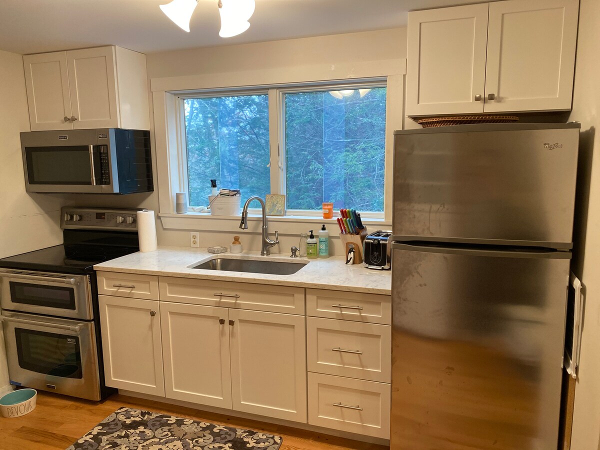 Bright, comfortable 1-bedroom apartment in a quiet Brunswick neighborhood — perfect for relaxing spring, summer, and fall visits. Just one mile from Bowdoin College with quick access to Route 1 and I-295, this bright and private space offers the perfect balance of peaceful surroundings and convenient location. Surrounded by trees and fresh Maine air, the apartment feels tucked away while remaining minutes from downtown Brunswick, Freeport outlets, coastal walks, and seasonal outdoor activities.