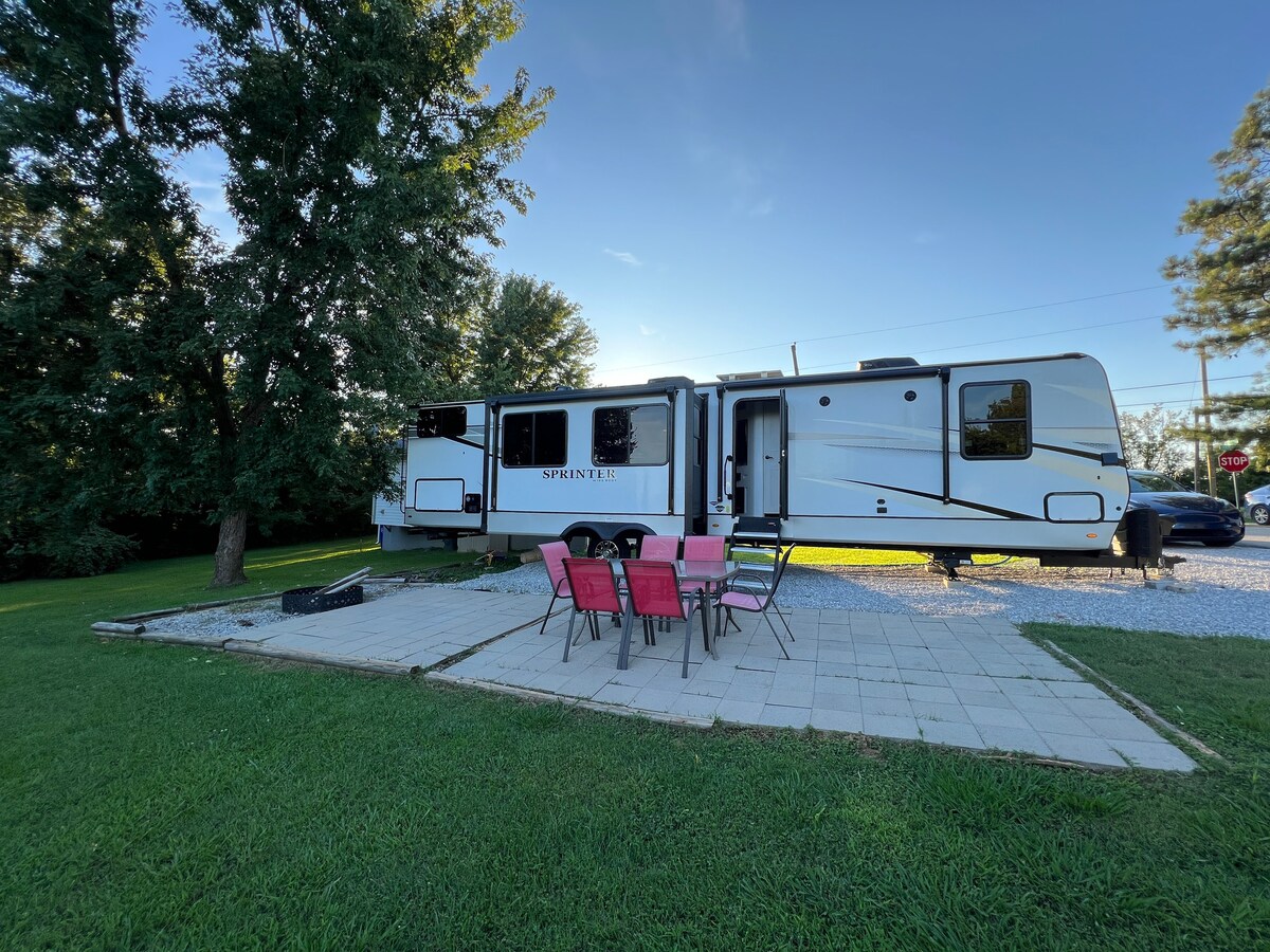 Enjoy a relaxing stay in this spacious 41-ft stationary camper in Leitchfield, KY. Perfect for families, couples, or travelers passing through, it sleeps up to 6 with a private king bedroom, and bunk room. Guests can enjoy a full kitchen, Wi-Fi, Roku TV, washer and dryer, free parking, and easy self check-in. A peaceful, comfortable, and budget-friendly home base near our lakes, Mammoth Cave and local attractions. This camper is located in a residential neighborhood.