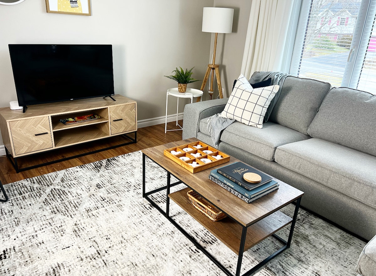 UPGRADED/BIGGER SPACE located in the Annapolis Valley. This flat is a beautiful escape whether it be business or pleasure it has all the needs of home.Sleeps 6 quests with 2 queen beds and a fold down comfy futon.Full kitchen, coffee, bbq, patio, washer & dryer. (see full amenities). Digital cable, Smart TVs, Wifi and Netflix provided.Mins away from the #1 Hwy, and the #101 Hwy to all towns, and tourism needs.5 min drive to the hospital for personal or professional stay.