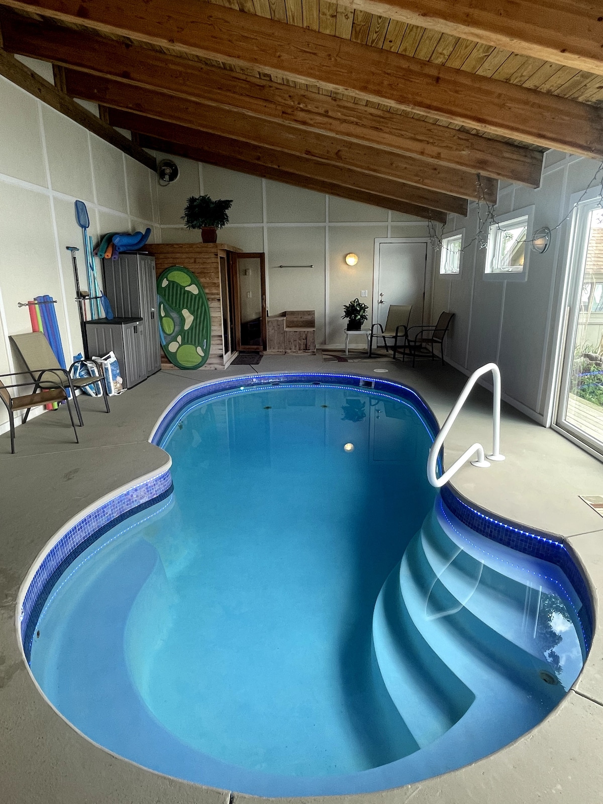 Uso privado exclusivo de toda la planta baja: Piscina cubierta climatizada Bañera. Sauna Baloncesto interior 1/2 cancha Hockey de aire Mesa de billar Ping pong Pickleball - bádminton - cornhole Máquina de pesas y elíptica Cocina completa. Sala de estar Sala de computadoras/juegos Lavadora/secadora Zonas exteriores: Playa de arena de 30' con sillas y fogata Cubiertas de varios niveles con sillas de gravedad cero 7 kayaks, 3 SUP, bote de remos y bote de remos de cortesía Los huéspedes comparten la entrada con los propietarios Alquiler de pontones disponible, ponte en contacto con nosotros