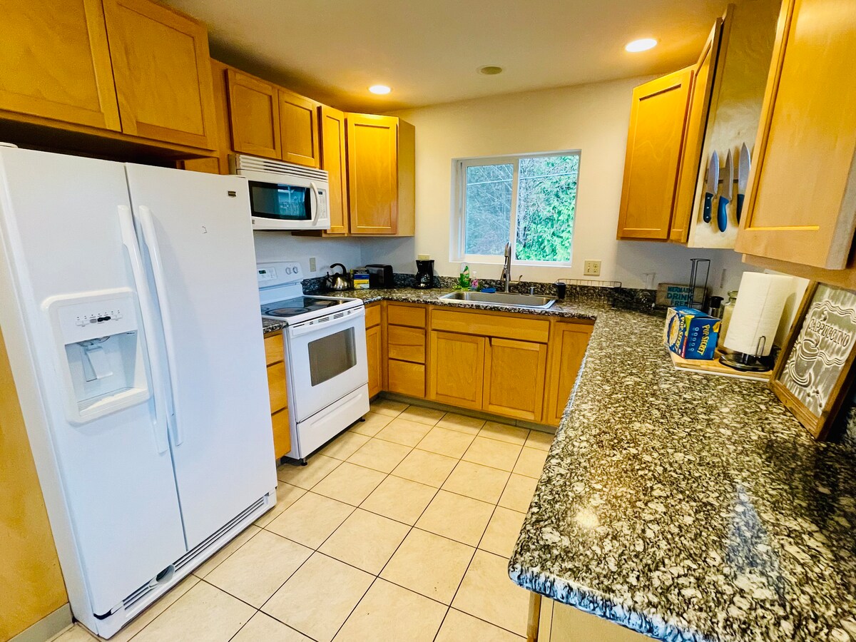 Just a short walk from Knudson Cove Marina this is a fisherman’s paradise! The living room features a 55” TV, large sectional couch and a futon. Enjoy a full kitchen with bar seating and a dining table. Outside, the covered deck is surrounded by trees and includes a BBQ, outdoor seating, and a chest freezer for your catch. It is the perfect spot for relaxing after exploring or fishing. There is also plenty of room for boat parking. Come enjoy your Alaska vacation today!
