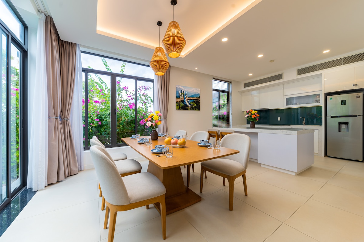 La villa Ocean Sand está en armonía con la naturaleza, con la playa verde, la villa tiene una hermosa vista al espacio verde, creando una sensación de relajación y paz... Con diseño de 2 plantas, 3 dormitorios modernos, aireados, cómoda bañera relajante La villa tiene un amplio salón, adecuado para familias o grupos de amigos que deseen tener un cómodo espacio para comer, organizar una fiesta de barbacoa al aire libre junto a la piscina de enfriamiento real. Cocina llena de utensilios para procesar, microondas, horno eléctrico gratuito