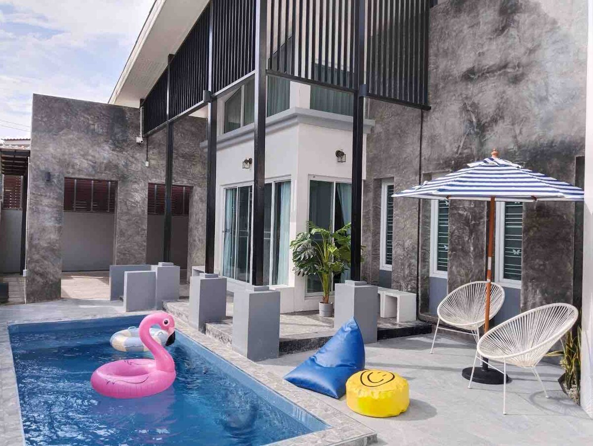 Piscina Villa Ranong Me gustaría recomendar una villa de piscina de estilo clásico moderno simple. 3 dormitorios, 3 baños, 1 cocina, 1 sala de estar, 2 plazas de aparcamiento dentro de la casa. Cerca de atracciones Con instalaciones completas Apto para familias, grupos de amigos o parejas. Turistas que quieren privacidad Hay mucho que hacer.