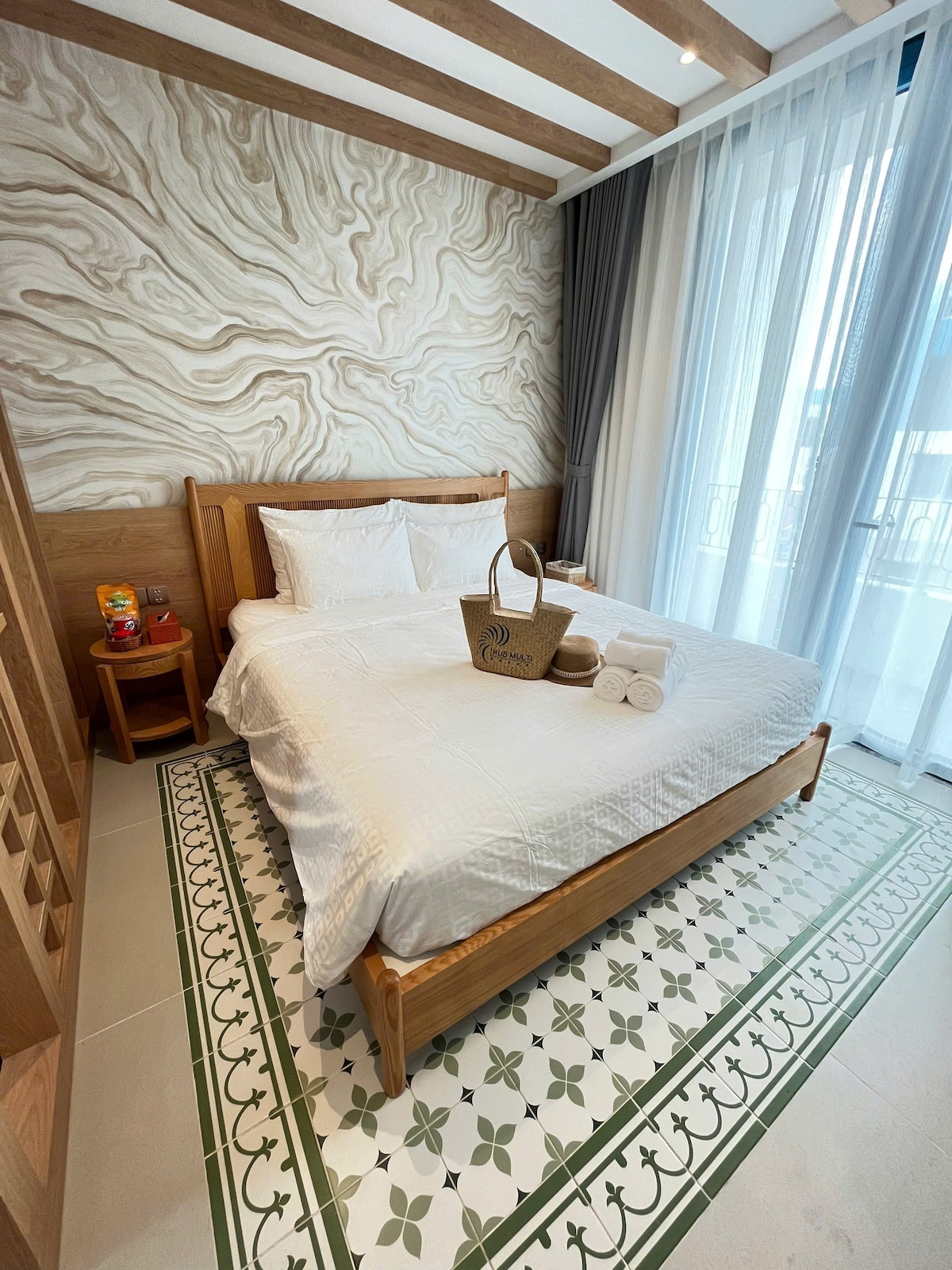 Mellon Oasis, located in the middle of Sunset Town (An Thoi). Address: Positano 91, Khu Sunset Town (Địa Trung Hải), An Thới Our spacious room (40m2) provides guests with a king bed (1.8×2m), 65-ich smart TV, air conditioning, work desk, mini fridge, sofa space, wardrobe, hair dryer, kettle and steam iron. Private bathroom comes with a bath that can fit 2 people and a rain shower.