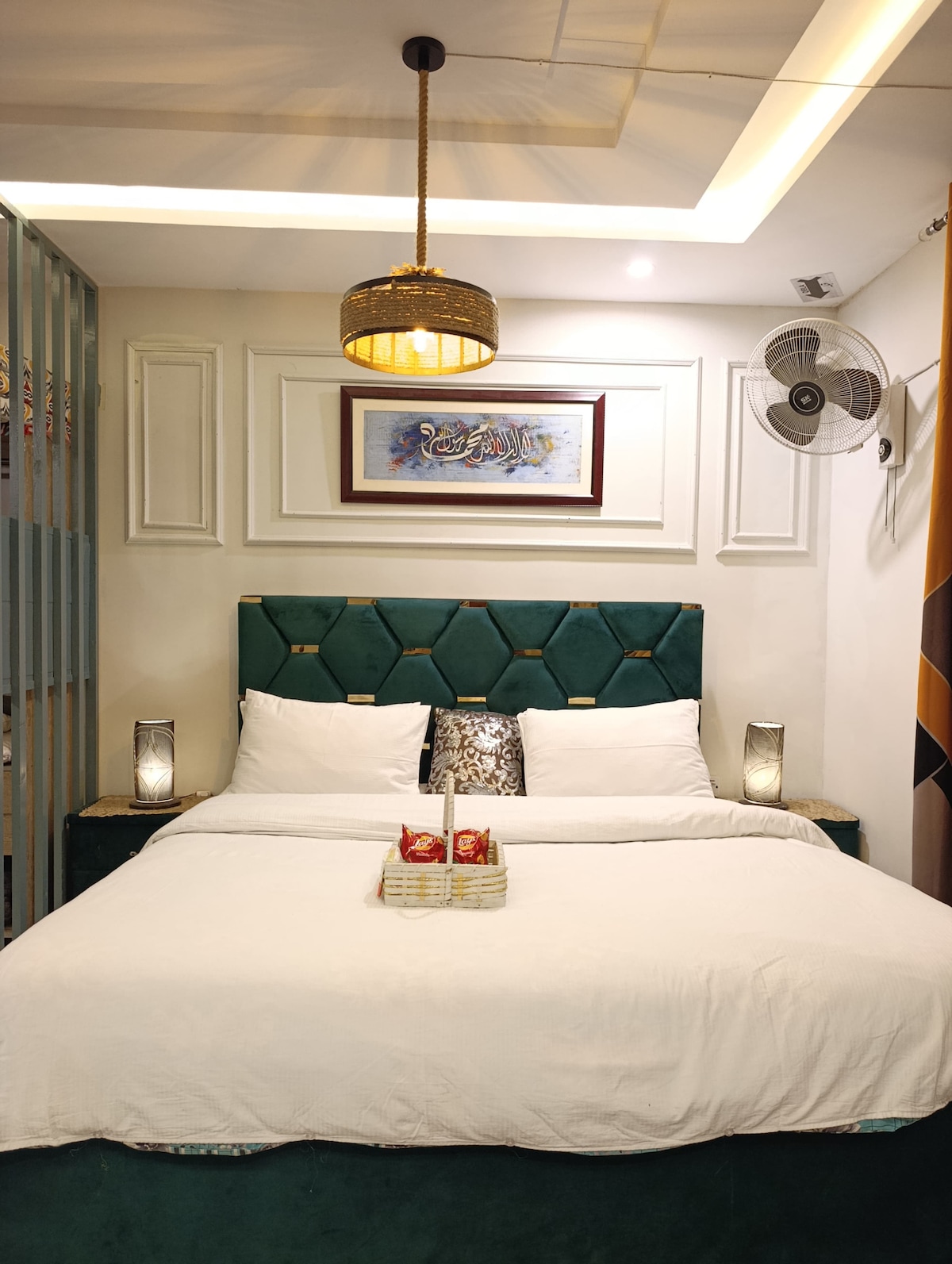 Disfruta de la serenidad en un apartamento de esquina de 2 dormitorios con temática Japandi, único en su clase, situado idealmente en el corazón del centro de Islamabad. El espacioso apartamento (1710 pies cuadrados) cuenta con un minimalismo moderno, dos balcones privados que ofrecen vistas panorámicas de las colinas de Margalla y Gulberg Greens, cómodas camas, espacio de trabajo dedicado, wifi de 40 mbps, un cine en casa para noches de cine acogedoras, juegos de mesa y una cocina abierta totalmente equipada para cocinar tu comida favorita. ¡Perfecto para familias, amigos o trabajadores remotos!