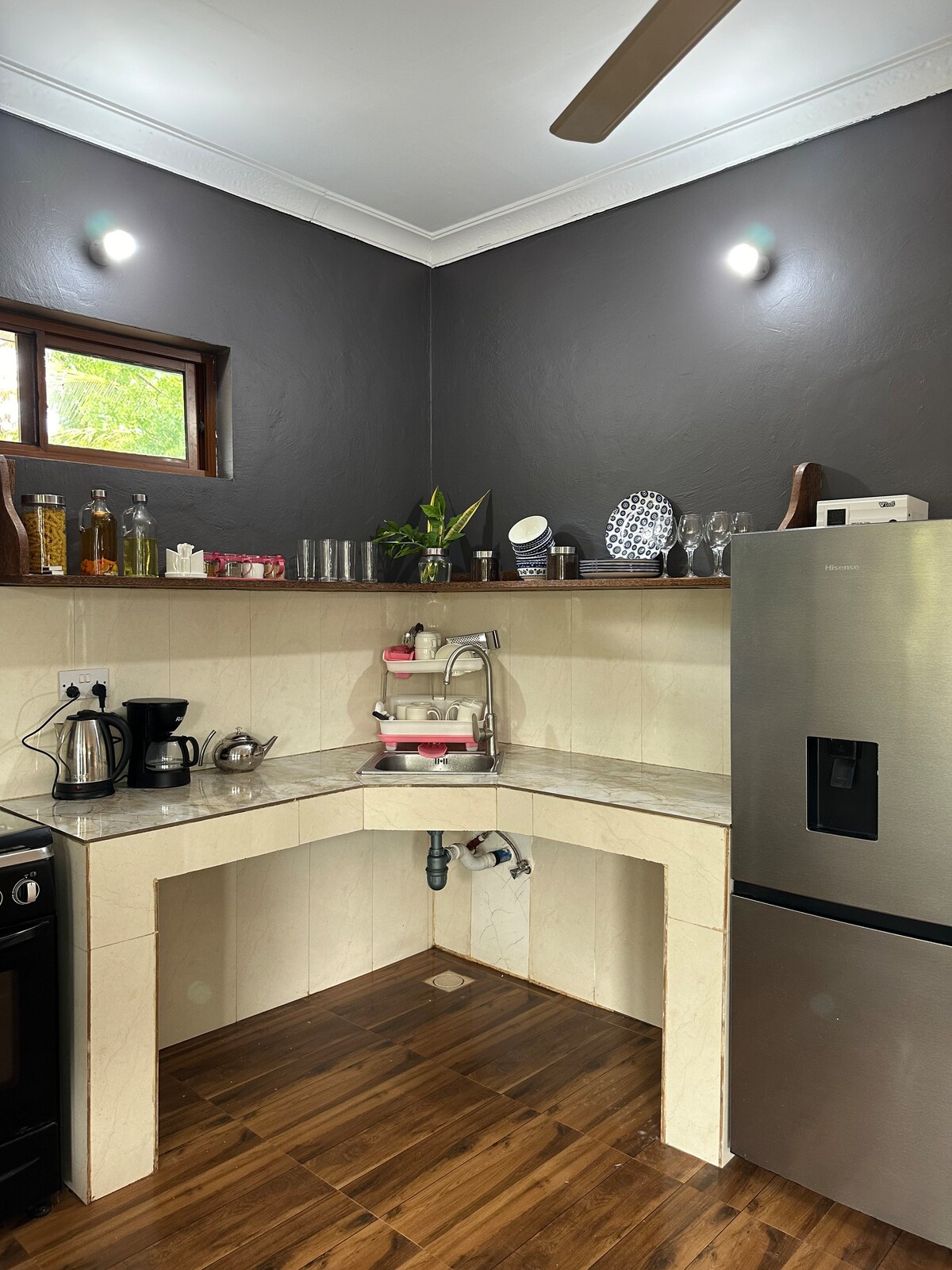 A meticulously designed, ground floor, one bed apartment with style and comfort in mind. Adorned with local hand crafted furniture and bathed in natural light, its turquoise accents offers a serene ambience that complements its breathtaking location overlooking the majestic Indian Ocean. The property boasts a fantastic location; 5 mins from airport, 10 mins to Stone Town. Whether you are on a family holiday, a honeymoon, or with friends, The Cliff @ Mazzini, is a true home away from home.