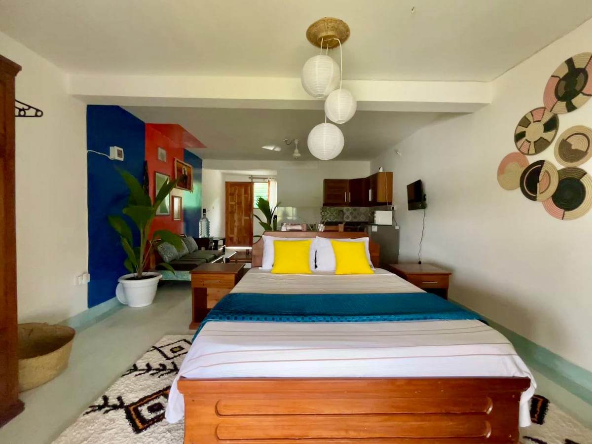 Impresionante estudio espacioso y ecológico, situado en terrenos de propiedad privada. Entre la casa principal de los anfitriones y el apartamento de nueva construcción. Experimentarás privacidad, lejos de las carreteras principales o centros vacacionales: lujo y paz asequibles. Modernizado y en una ubicación perfecta de tranquilidad, a pocos pasos de una playa privada con acceso a la inspiradora costa de Watamu, te encontrarás con un impresionante banco de arena. Esnórquel, buceo y deportes acuáticos disponibles. Mida Creek está cerca, ¡un lugar de primera para tomar una copa!