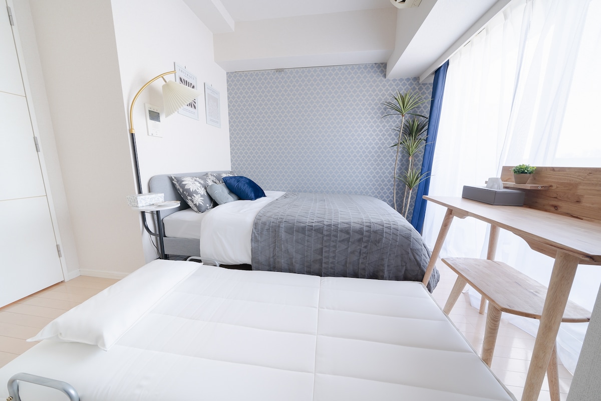 La estación de Kinshicho de la línea JR y la línea Hanzomon del metro de Tokio está a solo 5 minutos a pie. Muy cerca, encontrarás un gran parque verde donde podrás escapar del ajetreo y el bullicio de la ciudad. El apartamento cuenta con un interior tranquilo, suelos de madera cálidos, iluminación suave y grandes ventanales que permiten que la luz natural ilumine el espacio, creando un ambiente acogedor y refinado. El dormitorio incluye 1 cama doble y 1 cama semidoble, con detalles en azul que proporcionan un ambiente relajante.