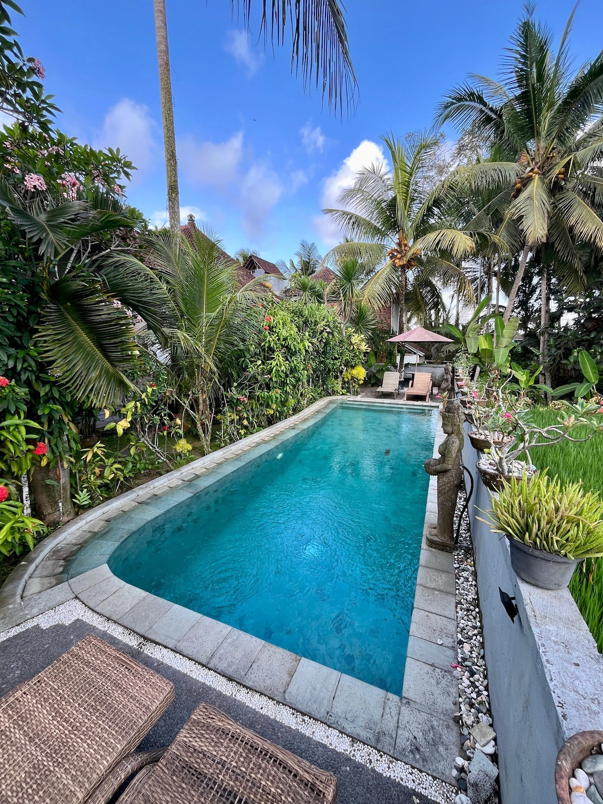 Una pequeña villa en Ubud diseñada de forma clásica y moderna con ambiente de Ubud. Que está gestionada por la familia propietaria de la villa. Las villas tienen forma de casas en Bali, pero no tienen tallas como las características típicas de las casas en Bali en general. Para nosotros, la comodidad y la hospitalidad de los huéspedes son muy importantes para la calidad de las vacaciones deseadas por el huésped. La ubicación de la villa, que da a los arrozales, se suma a la impresión de un ambiente relajante.