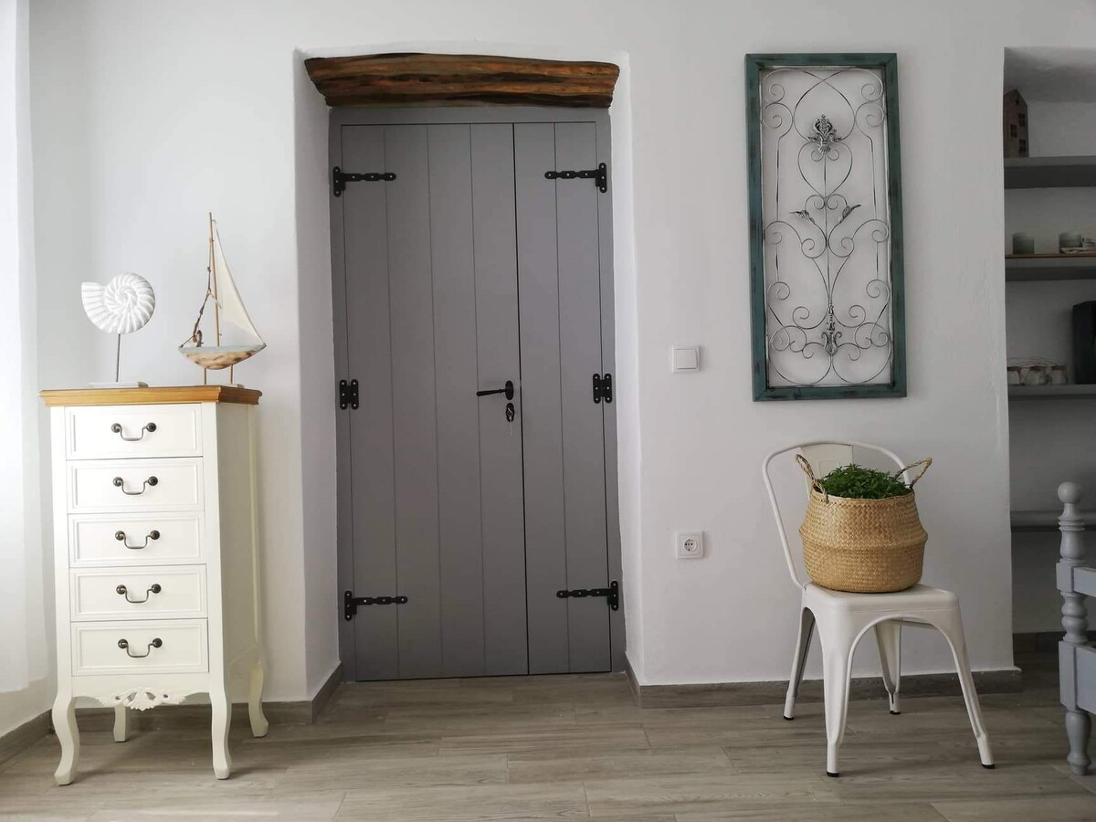 Πέτρινη σουίτα 10 μόλις μέτρα από την παραλία . Πολύ μεγάλα παράθυρα για να απολαμβάνετε την θέα Θάλασσα , εξωτερική πέργκολα με καθιστικό και τραπέζι . Πλήρη επιπλωμένη κουζίνα και άνετο μπάνιo/ντουζιέρα. Καθώς ανεβαίνετε τα ξύλινα σκαλοπάτια φτάνετε στο υπνοδωμάτιο όπου από το οποίο μπορείτε να απολαύσετε καλύτερα τη θέα της θάλασσας. Η έντονη παρουσία του ξύλου σε συνδυασμό με το χτιστό κρεβάτι και τον καναπέ σε παραπέμπει στα αρχοντικά σπίτια των Κυκλάδων.