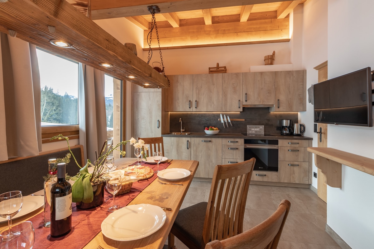 NUEVO en Holzerhof - Acogedor apartamento con encanto con mucha madera antigua... El espacioso apartamento tiene 100 m2 con 2 dormitorios y una gran sala de estar (sofá cama de 1,7*2 m/somier/colchón). El baño está equipado con ducha, una gran bañera de esquina para 2 personas y 2 lavabos. Un inodoro en el baño y otro en una habitación separada. La cocina está totalmente equipada. El balcón con sol por la mañana y por la noche y unas vistas de ensueño del Wilder Kaiser.