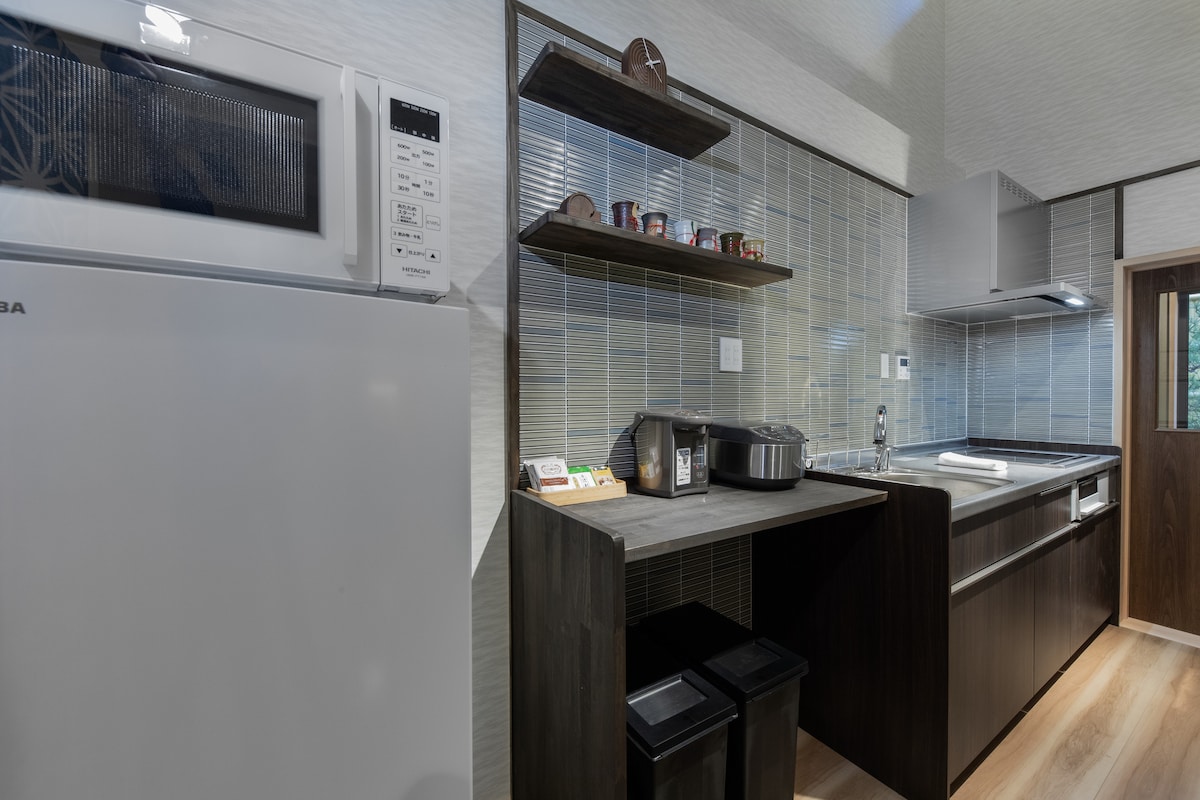 Kyomachiya Private Lodging "Takasegawa Shichijo" es una kyomachiya de 115 años completamente renovada. La kyomachiya, que forma el hermoso paisaje de Kioto, se ha remodelado en un edificio con un alto rendimiento de hermeticidad y aislamiento térmico para que puedas pasar un tiempo cómodo en los veranos húmedos y los inviernos fríos únicos de Kioto mientras conserva la estructura original. Desde la habitación de estilo japonés en el primer piso, se puede ver el jardín tsubo (un jardín que conduce a la sala de té) con una imagen "roji". Además, hemos preparado un sofá en el pasillo para que puedas relajarte y disfrutar de la vista del jardín tsubo. Por la noche, puedes pasar un rato relajante mientras miras el jardín tsubo iluminado. Hay 2 dormitorios en el segundo piso, uno con 2 camas individuales y uno con 1 cama doble. Si hay 5 o más huéspedes, podemos preparar un futón en la habitación de estilo japonés en el primer piso y usarlo como dormitorio, aunque es un poco molesto. La cocina está equipada con utensilios de cocina y platos para cocinar de forma sencilla.