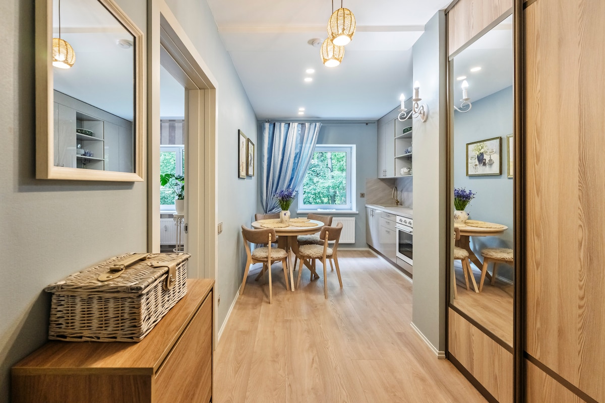 Apartamento tipo loft muy acogedor, único y exquisitamente diseñado con terraza privada y vistas panorámicas a la naturaleza. A 600 m. del mar: este es un gran lugar para parejas, familias que buscan privacidad y conexión con la naturaleza.Es un lugar donde el pulso de la ciudad se fusiona con la tranquilidad y brinda a los huéspedes una sensación excepcional de relajación de calidad.Los grandes ventanales panorámicos permiten admirar la naturaleza incluso estando en casa, y es agradable relajarse en la terraza, disfrutar de la paz y el aire fresco del mar.