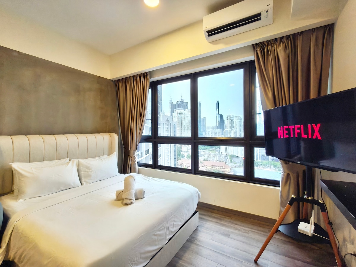 Este apartamento de 1 dormitorio cuenta con una vista impresionante del horizonte de KL. Cuenta con un salón con sofá de 3 plazas, mesa de comedor, cocina, escritorio y un gran balcón frente a la Torre KL y las Torres Petronas. Viene con TV de 55 pulgadas, wifi de alta velocidad y una cama tamaño queen en la que puedes acomodarte cómodamente. *La otra unidad de este apartamento de llave doble es un estudio compacto con cama tamaño queen, despensa, baño y bañera. Pueden caber amigos que viajan contigo con privacidad. ¡Te invitamos a solicitar más información!