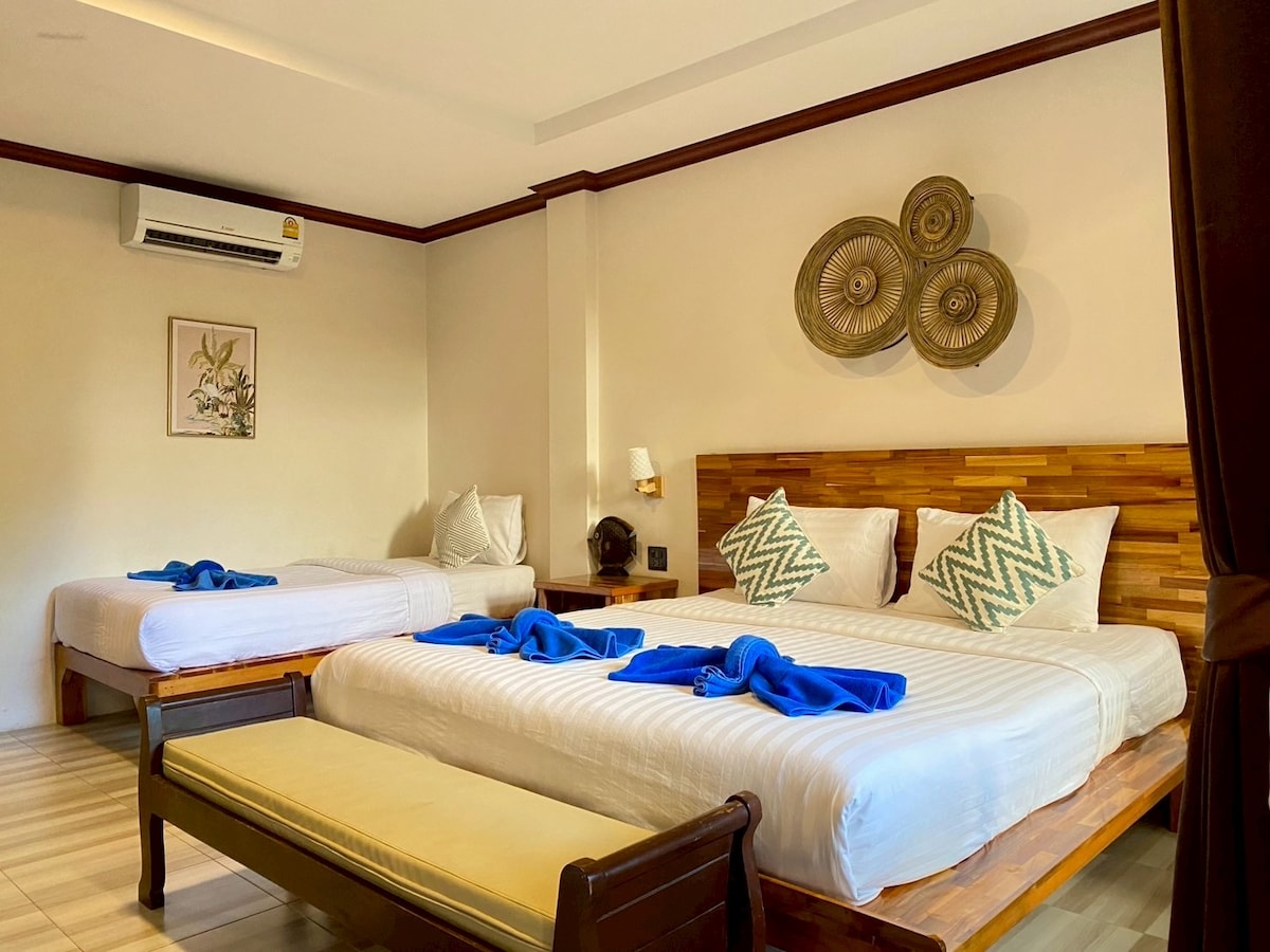 Our Garden View Room is the ideal choice for 2-3 friends looking to balance comfort and affordability while enjoying the beauty of Koh Phangan. This spacious, air-conditioned room features one queen size bed and one single bed. Nestled on a tranquil private road, our resort offers a peaceful escape just a 5-minute walk from the bustling heart of Haad Rin. Discover nearby restaurants, shops, and the main beach, famous for the Full Moon Party.