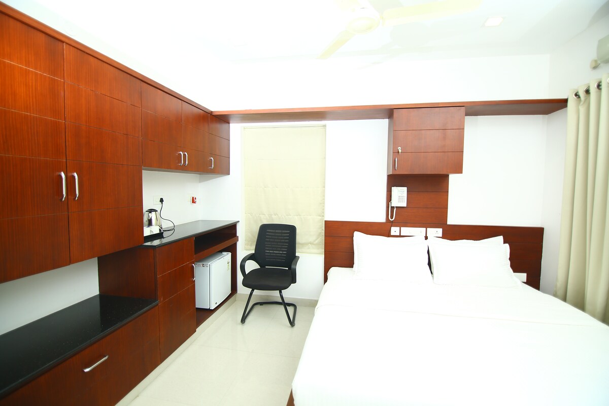 Habitación bien amueblada con todas las instalaciones modernas como TV LCD con conexión por cable, aire acondicionado, agua fría/caliente las 24 horas, 7 días a la semana. Las camas son tamaño king con colchones muy acogedores y cómodos. Los baños están equipados con todas las comodidades modernas y necesarias. La habitación está a solo un kilómetro de la estación de tren Ernakulam Junction y a un kilómetro de la estación de autobuses KSRTC.