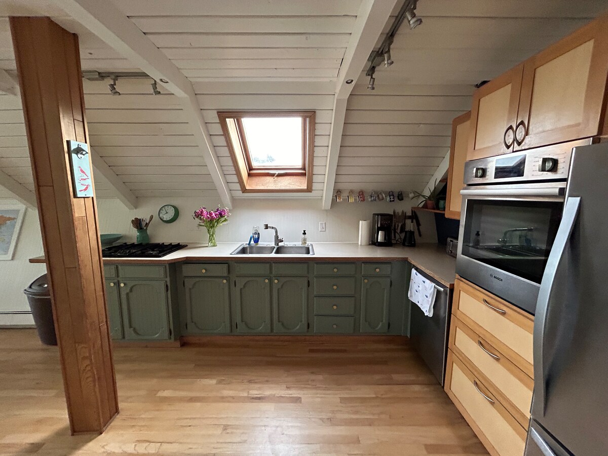 Si buscas unas vistas impresionantes al hermoso puerto de Kodiak, ¡este es tu lugar ideal! Arriba, una espaciosa sala de estar abuhardillada con techos abovedados tiene las mejores vistas. Relájate con un café por la mañana y, si tienes suerte, podrás ver una manada de orcas nadando. O pasa tiempo en la terraza en un día soleado de verano asando una comida casera. Ten en cuenta que debes estar preparado para subir y bajar escaleras para acceder a la casa.