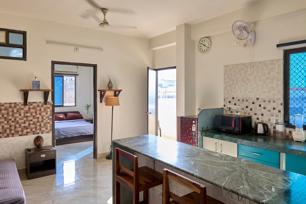 Ideal home for a FAMILY - Luxurious 2-bed, 2-bath apartment in Udaipur’s busy location ideal for families, travel enthusiasts or working professionals. Sleeps 5 with 2 double beds + 1 divan-style sofa bed. Modern décor, 70”smart TV, L-shaped sofa, AC in every room, two balconies, fully equipped kitchen, and workspace. Walking distance to cafes, restaurants, shops, temples, schools. Housekeeping and daily cleaning ( available on prior request) included in the price.