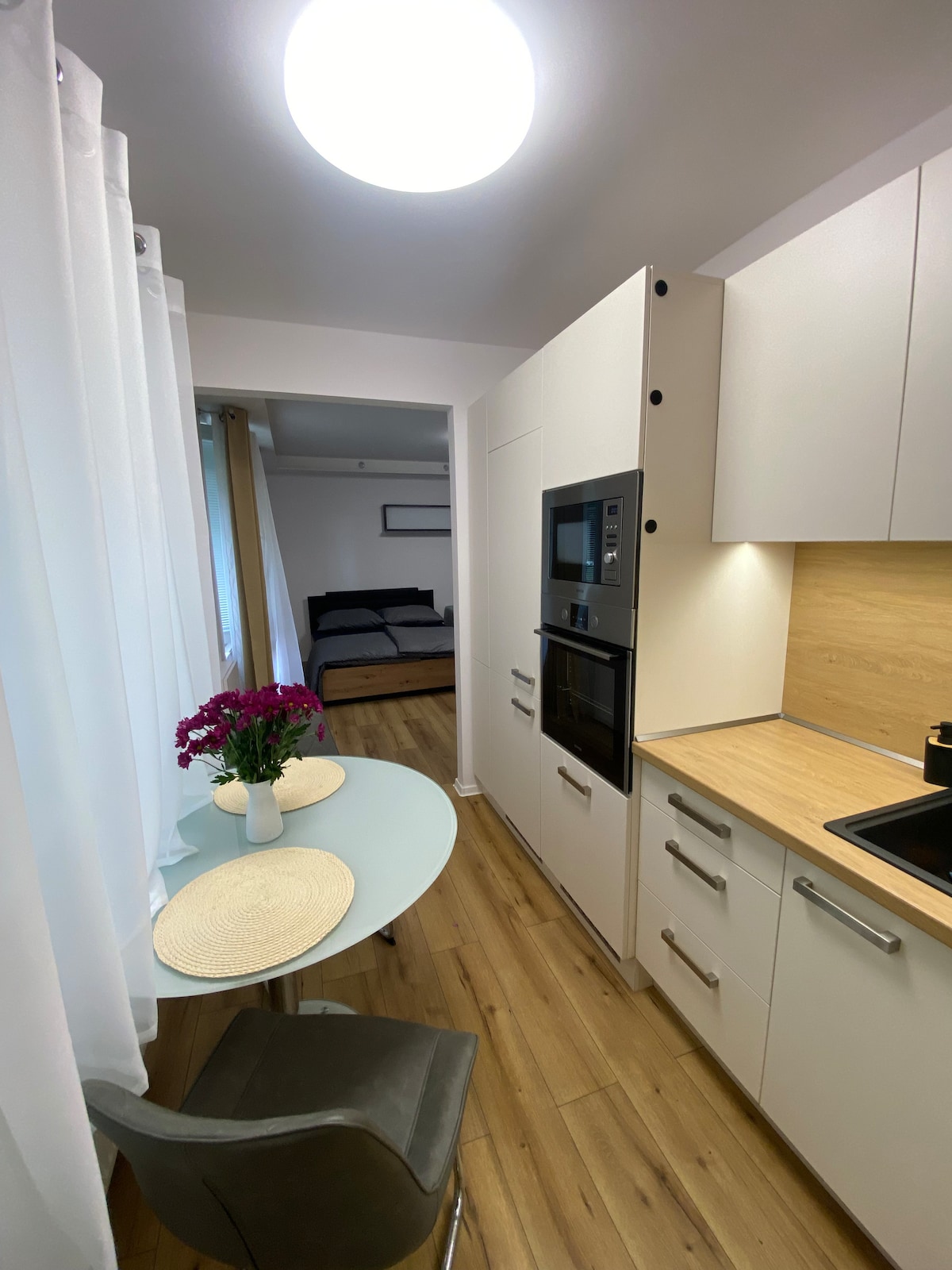 Tu nuevo y elegante apartamento ofrece una estancia cómoda para un máximo de 2 personas. Se encuentra en una nueva urbanización a pocos minutos del centro de la ciudad. El alojamiento está totalmente amueblado (electrodomésticos de cocina, wifi, TV inteligente Antik, etc.) y está listo para tu estancia. Hay aparcamiento gratuito en el espacio subterráneo designado. La seguridad de la propiedad y de los huéspedes la proporciona una empresa de seguridad privada.
