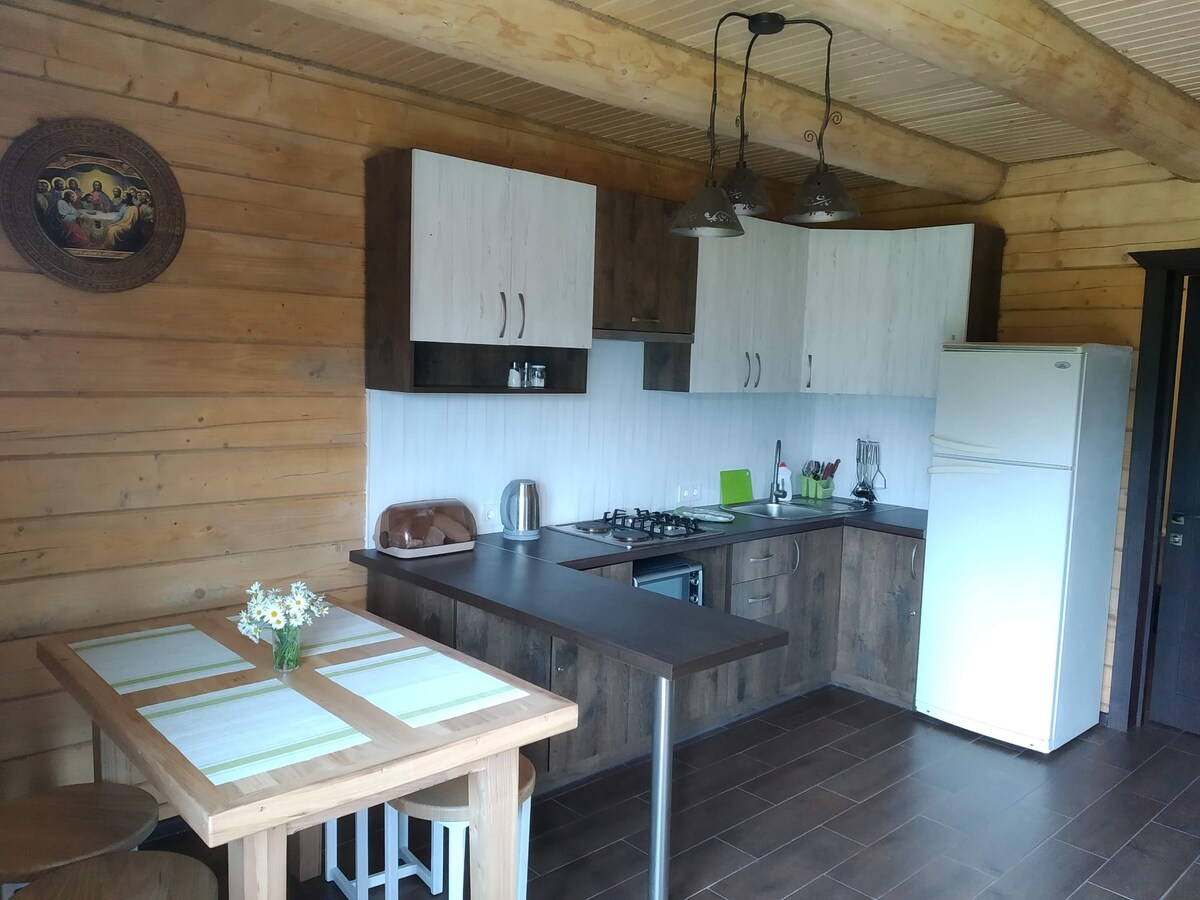 1-кімнатний дім з маленьким кухонним кутком (чайник, електрична плитка, мікрохвильовка, раковина з водою) і власним санвузлом. При бажанні господиня Вам приготує двічі на день такі смачні страви з гуцульської кухні, що пальчики оближеш. Господиня Настя здоїть Вам молочко прямісінько від корови, або по бажанню спробуйте здоїти корівку самі.