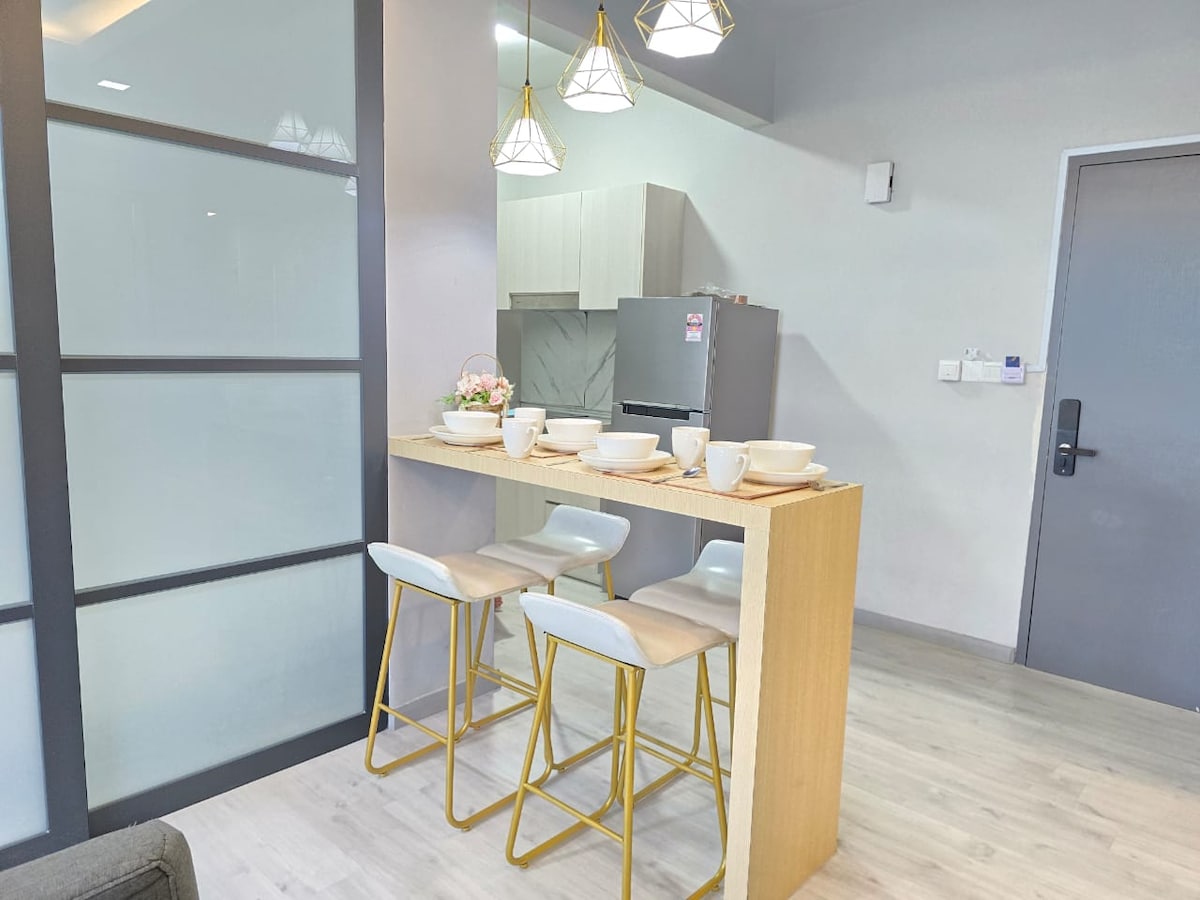 Nuevo apartamento ubicado en el distrito financiero y junto a la bahía marítima. Disfruta de vistas al mar rodeadas de islas en nuestra unidad de piso alto. A poca distancia a pie de Jetty, con comodidad para ir de isla en isla; el centro de convenciones internacional, el centro comercial Jesselton (Duty Free) y el centro comercial Suria Sabah están cerca. Nuestra suite es limpia, con desinfección frecuente y purificador de aire. Ideal para familias y también adecuado para parejas y viajes de negocios.