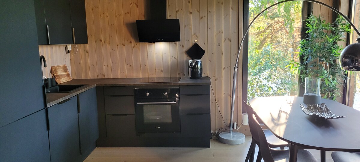 Acogedora cabaña, cerca del mar con vistas al mar y bonitas zonas al aire libre. La cabaña principal tiene una sala de estar, un comedor y una cocina. 2 dormitorios (2+2 camas) y un inodoro de combustión en una habitación separada. Grandes ventanales de cristal a ambos lados, que aportan un ambiente luminoso y abierto. En la sala de estar. Además, hay un anexo de 15 metros cuadrados, con 2 literas familiares y un televisor (solo Apple TV). Número recomendado de invitados: 4-6 adultos + niños. Máximo 8 personas en total. Esto se debe al inodoro de combustión.