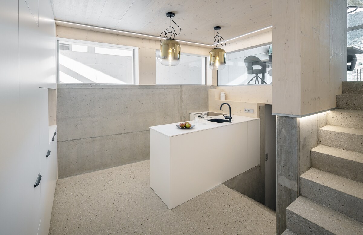 Para disfrutar de las vistas atmosféricas de los viñedos, hay interiores extremadamente hermosos con el máximo efecto de sentirse bien. Apartamento "Bruck": el más grande de nuestros apartamentos, en dos plantas y tres niveles, abierto y luminoso, con espacio para cuatro, fachada de vidrio y terraza panorámica, cocina privada, larga mesa de madera para largas noches y desayuno tardío y mucho ambiente.