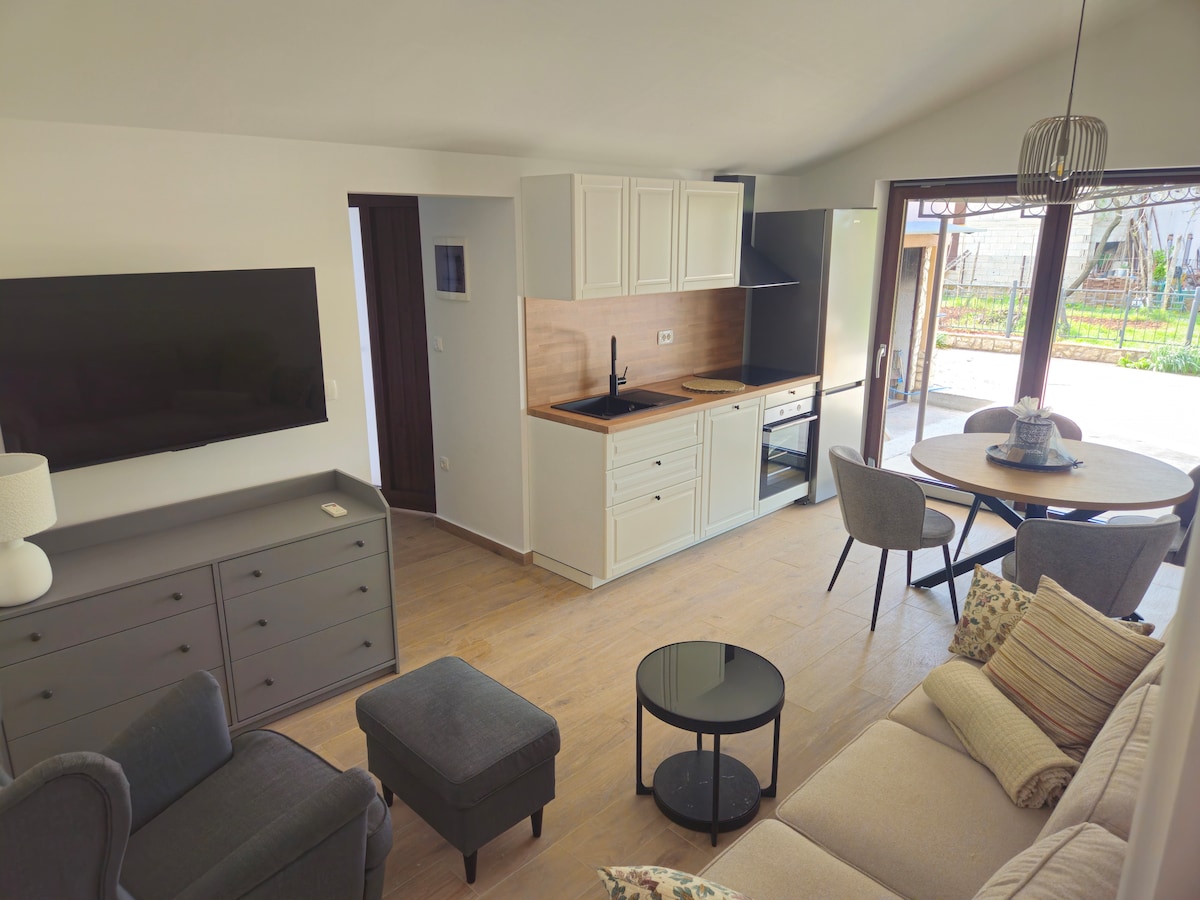 El apartamento está situado en la parte este de Nuevo Vinodolski, tranquilo y verde, a unos 800 metros del centro y a 150 metros del mar. Situado en la planta baja en una pequeña casa independiente con techo de catedral decorado con vigas de madera real. Está totalmente equipado, con vistas a la costa este de la isla de Krk. En el exterior hay una terraza. Se admiten mascotas; la tarifa por mascota es de 10 EUR por día.