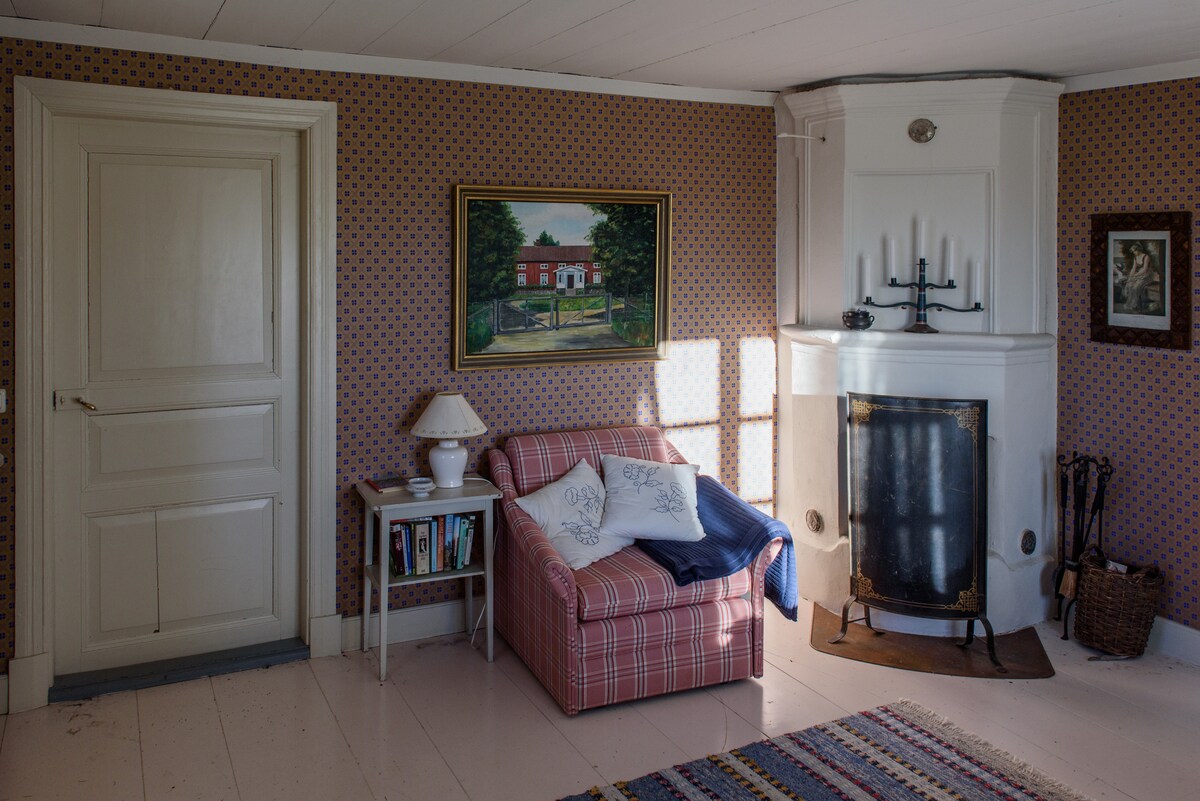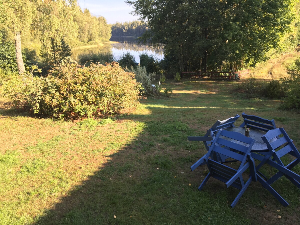Casa de campo con una sola ubicación ubicada en parte de la parcela con la posibilidad de pedir prestado un bote de remos. La parcela bordea el lago, bosque y campos. La parcela se comparte con el propietario, pero los huéspedes tienen parte de la propiedad para ellos solos para disfrutar. En los prados/campos, ciervos vagan y si tienes suerte, también puedes ver alces. Hay oportunidades para hacer senderismo.