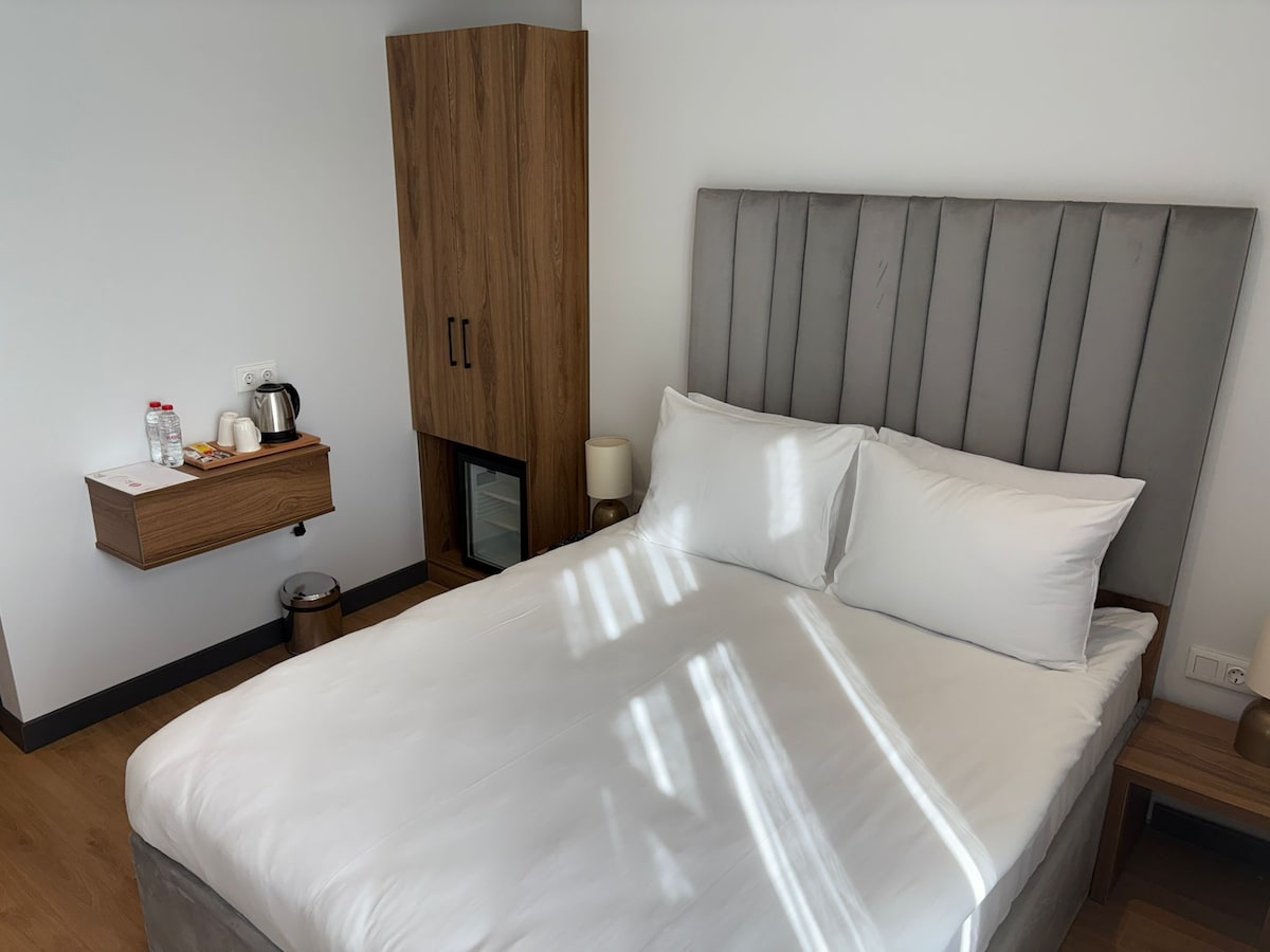 Yeni ve modern çift kişilik oda; konforlu yatak, klima, hızlı Wi-Fi ve Netflix TV sunar. Özel banyoda duş ve temel malzemeler vardır. Plaj ve orman yürüyüş mesafesinde. Otel kafemiz gün boyu açıktır. Modern double room with comfy bed, AC, fast Wi-Fi, Netflix TV, and private shower. Beach and forest are within walking distance. Hotel café open all day.
