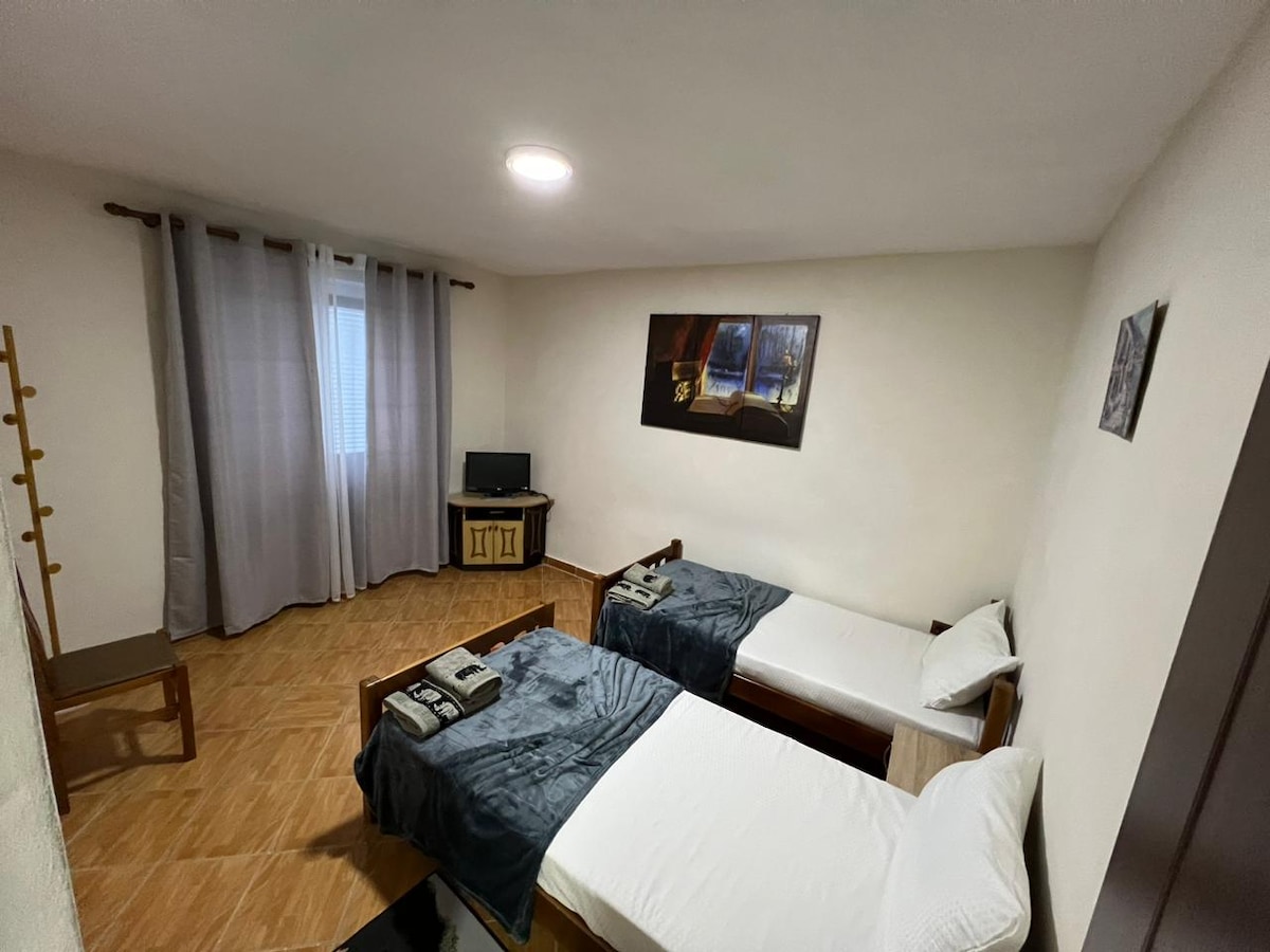 Welcome to our AirBnB! Our cozy apartment features two rooms, each furnished with two comfortable single beds, making it perfect for solo travelers, couples, or families of four. Just a 5-minute drive from the Fierze-Koman ferry stop, where you can embark on scenic journeys to Koman or Lumi Shales, and only 50 minutes from the stunning National Park of Valbona. Plus, you can enjoy serene lake views right near the apartment. Book your stay now for a peaceful experience!