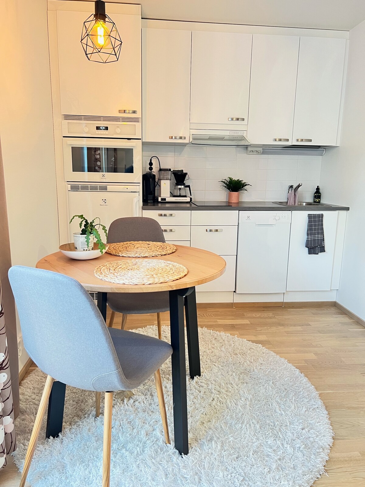 Sencillo en este lugar céntrico. El apartamento tiene una plaza de aparcamiento gratuita y aire acondicionado en verano. El apartamento renovado se encuentra a una manzana de la plaza, a solo 350 metros a pie de la estación de tren. Desde la ventana se puede ver la torre de la catedral, ¡y la vida de restaurantes de Kuopio le espera a solo dos manzanas de distancia! El apartamento tiene una cama doble de 160 cm de ancho y, si es necesario, el sofá también puede alojar a una persona adicional (NOTA: área para dormir limitada; 180 cm×85 cm).
