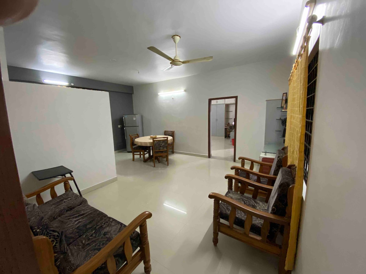 Relájate con toda la familia en este tranquilo y encantador apartamento de 2 dormitorios totalmente amueblado. Ambas habitaciones tienen aire acondicionado para combatir el calor del verano. La unidad de 2 dormitorios está en el primer piso ubicado en el centro de Hyderabad con todos los servicios. Restaurantes como Peshawar, Pista House, Sohail Hotel, Paradise, restaurante árabe y muchos otros lugares para comer fuera y comida rápida. Cine PVR, estación de metro, supermercado, tienda médica cerca, fácil acceso a la ciudad del cine Ramoji y a todos los demás lugares turísticos. Por favor, sigue las normas de la casa.