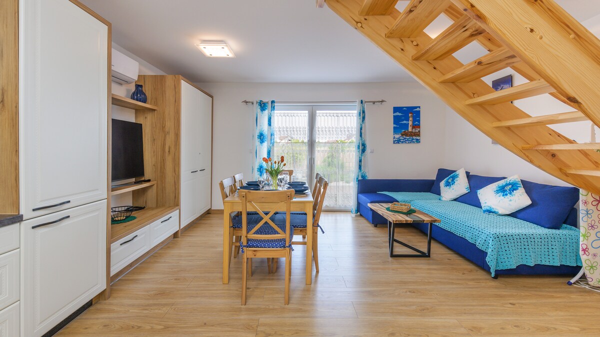 Ofrecemos un apartamento en una casa adosada con una superficie de 90 m2, diseñado para 4-7 personas. La casa que se muestra en la foto consta de 2 apartamentos separados (Parte 1 y Parte 2). Cada apartamento es independiente y tiene una entrada independiente. Totalmente equipado: lavadora, televisor inteligente, wifi y mucho más. Dos dormitorios, salón, cocina, baño. Distancia al mar: 250 m. Es posible alquilar ambos apartamentos juntos si están disponibles.
